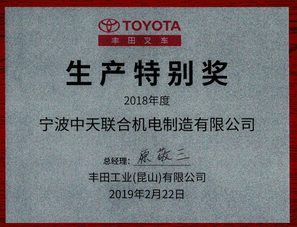 中天聯合機電喜獲豐田工業(昆山)有限公司2018年度生產特別獎